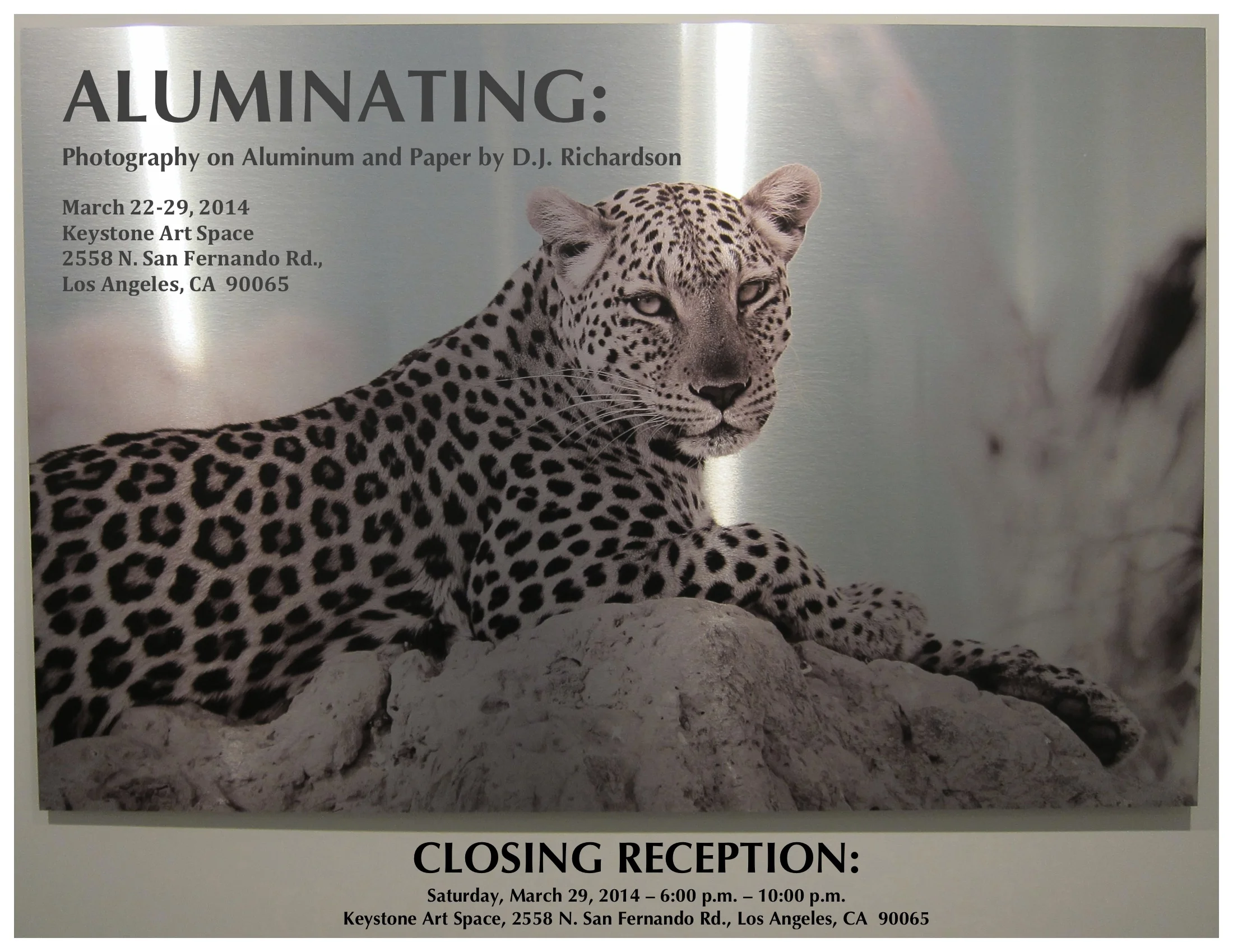 ✚ gCal ✚ iCal Join us for a closing reception of DJ Richardson's solo exhibition ALUMINATING. An evening of refreshments, coversation, and beautiful photographs.