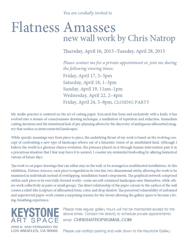 ✚ gCal ✚ iCal Keystone artist Chris Natrop presents new large-scale wall work at Keystone Gallery, on view April 16-28 during select times and by appointment, with a closing party on Friday, April 24, 5-8pm.